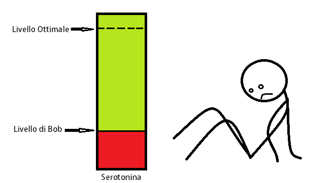 Per capirlo, andiamo a vedere cosa succede all’interno della testa di Bob. Tralasciando tutte le teorie biologiche sulla depressione (che, se volete approfondire, le trovate nella buona vecchia Wikipedia) e semplificando tantissimo, diciamo che nel cervello di Bob è avvenuta una diminuzione della quantità di un ormone (oltre che di altre sostanze) chiamato Serotonina, detto anche “ormone della felicità” per il suo effetto positivo sull’umore. Avendo poca serotonina nella testa, Bob ha quindi diminuito drasticamente la sua “felicità”, fino alla tristezza più cupa.
