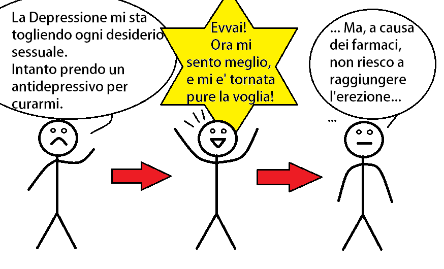 Bob, tra l’altro, è stato fortunato: solo il 50-75 % risponde positivamente ai farmaci antidepressivi. Se la terapia non avesse fatto effetto, lo psichiatra avrebbe dovuto aggiungere ulteriori farmaci o sostituirne alcuni con altri antidepressivi e, di conseguenza, sarebbe aumentato il rischio di danneggiare stomaco, fegato, e altri organi essenziali per la sopravvivenza. Inoltre, gli psicofarmaci hanno moltissimi effetti collaterali; i più comuni sono: emicrania, nausea, insonnia, agitazione e sensazione di nervosismo, e problemi sessuali (sia negli uomini che nelle donne, con riduzione dell’impulso sessuale, disfunzioni erettili, ritardo dell’eiaculazione o anorgasmia).