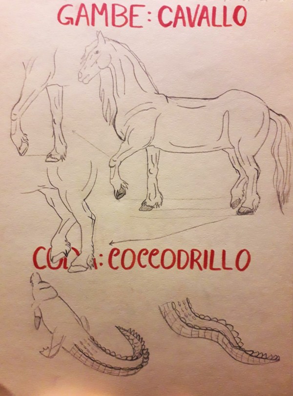 Ed ecco il mio mostriciattolo, con la testa di pesce, il torso di gamberetto, la coda di coccodrillo, le gambe da cavallo e le braccia umane: